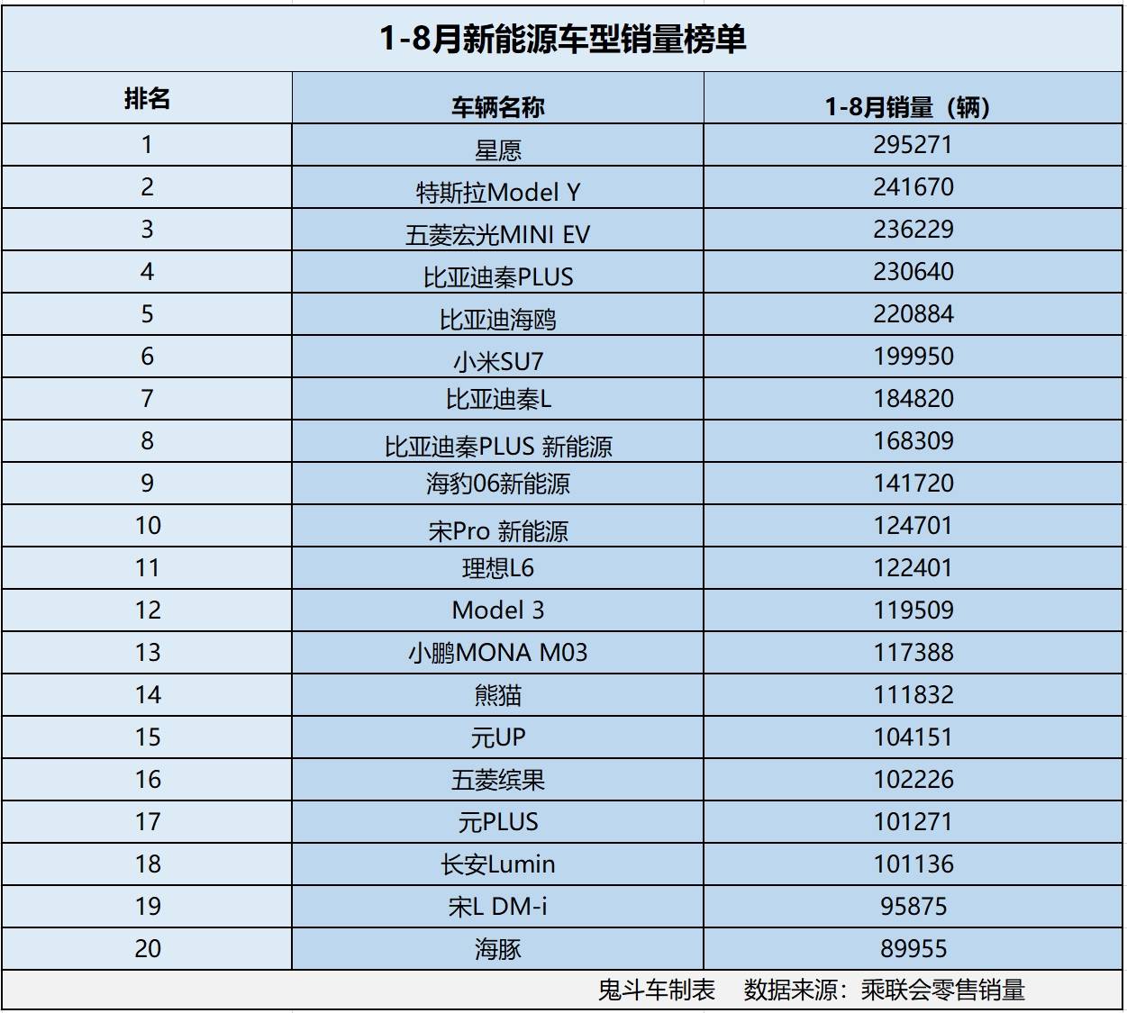 那么百家乐破解方法✿★,哪些新能源车型卖得更好✿★,更值得消费者关注?不妨看看销量榜单✿★,鬼哥根据乘联会零售销量数据九游会官方网站✿★,整理出1-8月新能源车型零售销量前二十排名榜单✿★。结果✿★,鬼哥发现✿★,这份榜单上✿★,1-8月份✿★,共有18款新能源车型累计零售销量超过十万辆✿★。接下来✿★,看看具体车型的销量表现与排名✿★。